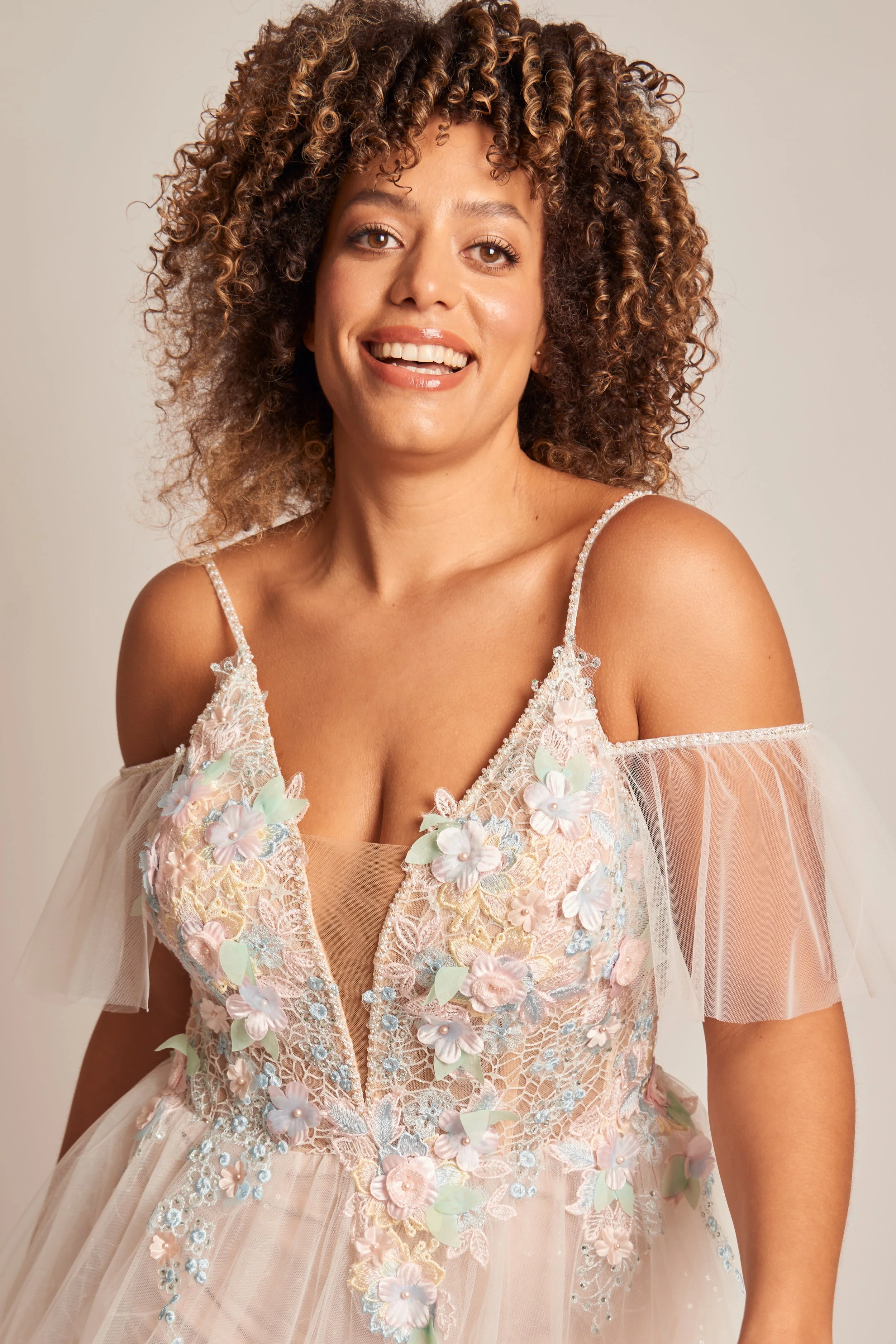 Get ready to turn heads in this bold and exquisite wedding gown that's sure to take your breath away. Made from delicate floral embroidered tulle fabric, the dress features a boning structured bodice that offers a flattering shape to your figure. The fitted stretch lining and flowy shimmer layer on the skirt create an elegant and romantic look that is perfect for your big day. The dress also features beautiful lace details around the bottom of the skirt, adding a touch of dreamy and romantic charm to the overall design. Make your wedding day unforgettable in this stunning floral embroidered tulle wedding gown.