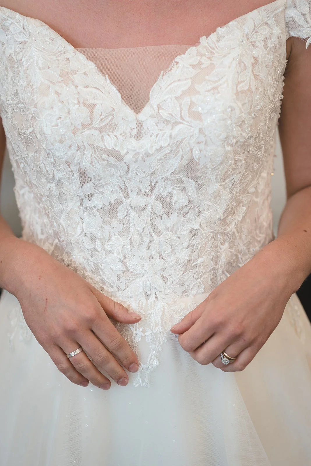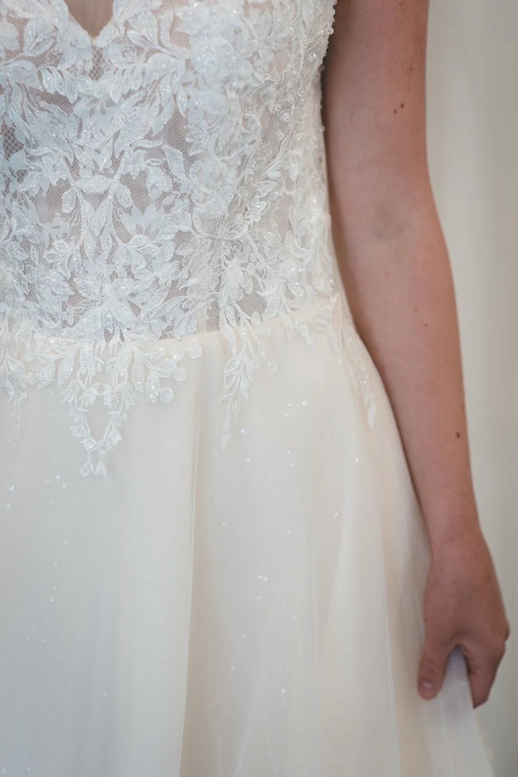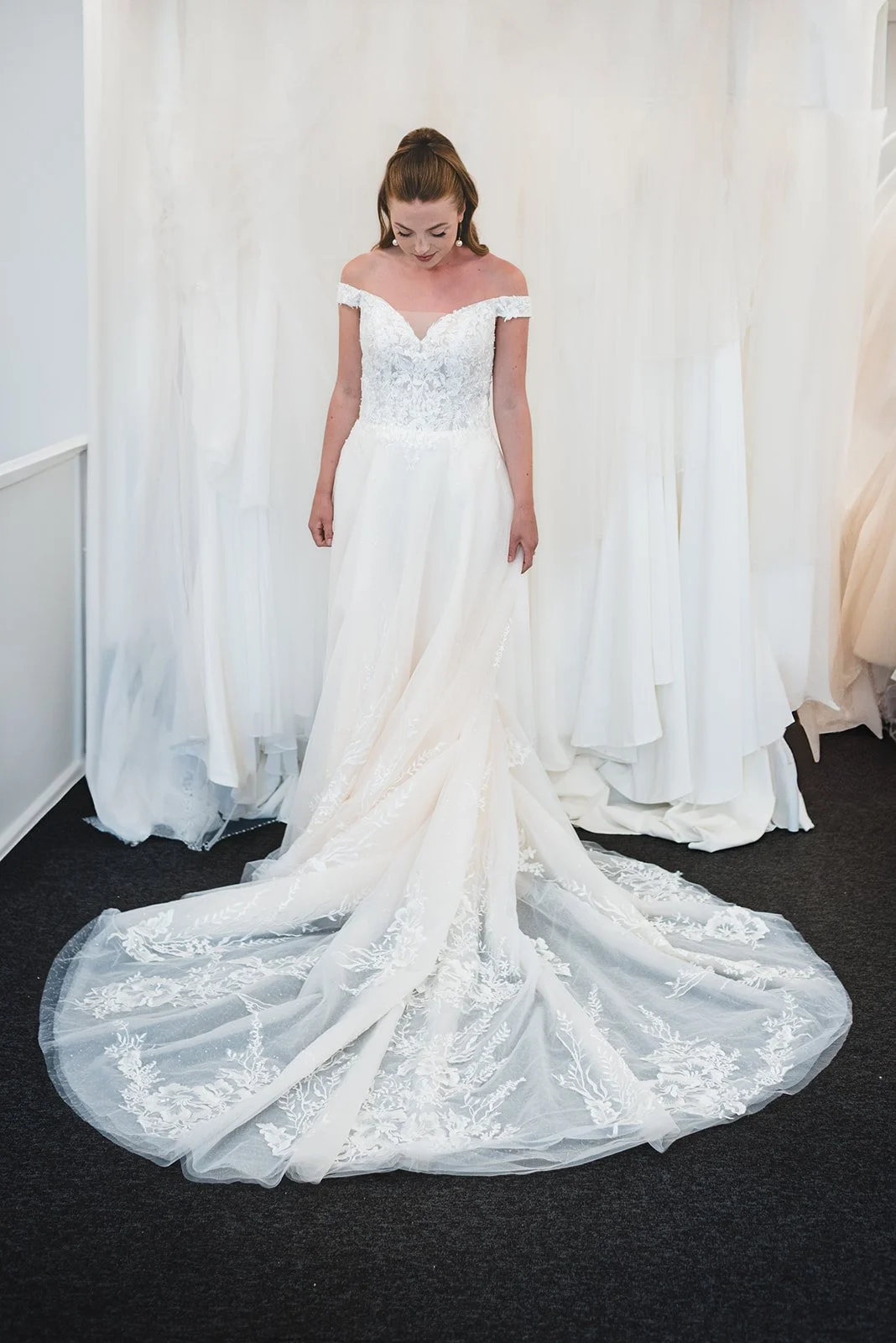 Alina is pure fairytale romance with a modern glow. Crafted in whimsical lace with delicate embellished details, this dreamy A-line gown shimmers softly in a gorgeous champagne hue. The off-the-shoulder neckline adds a touch of timeless elegance, perfect for brides craving a little enchantment on their big day.